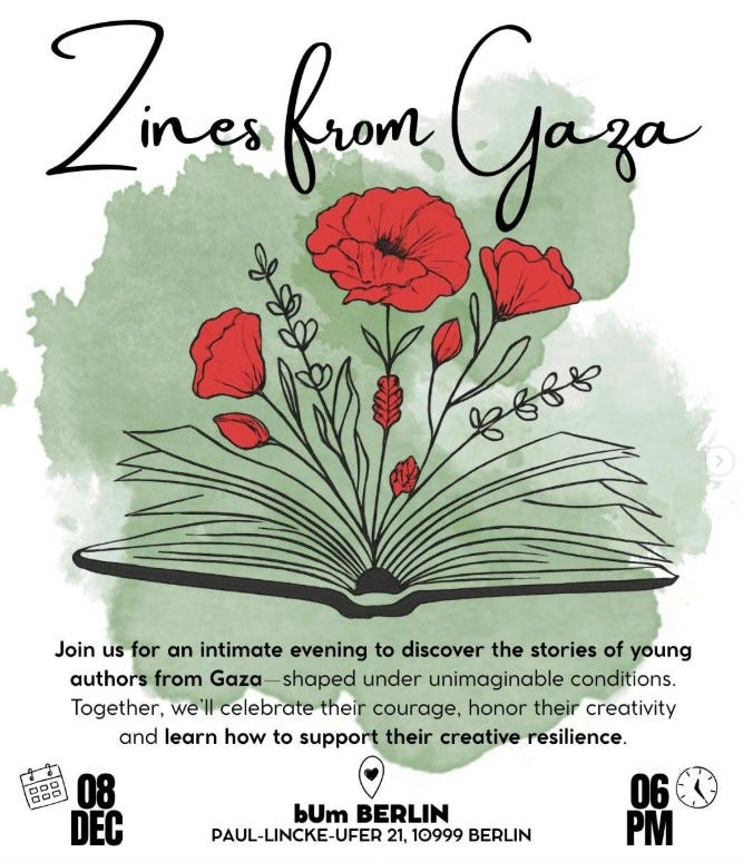 On December 8th, Zines from Gaza joined PALLIES in Berlin for an evening dedicated to amplifying the voices of young authors from Gaza. Through zines, storytelling, and conversation, the event highlighted what it means to create art and literature under the conditions of siege, displacement, and ongoing genocide.