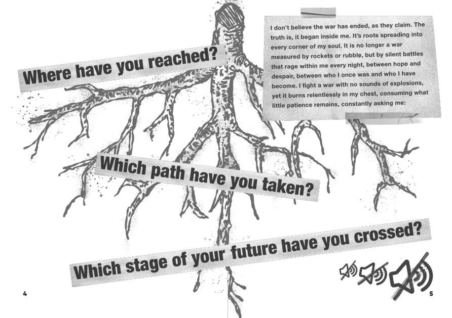 An edgy zine with a strong visual narrative to match the author’s reflections on life inside Gaza after annihilation. When nothing remains, where might a person’s roots cling? The answer: your empathy, dear Reader. Here is a voice from the future.