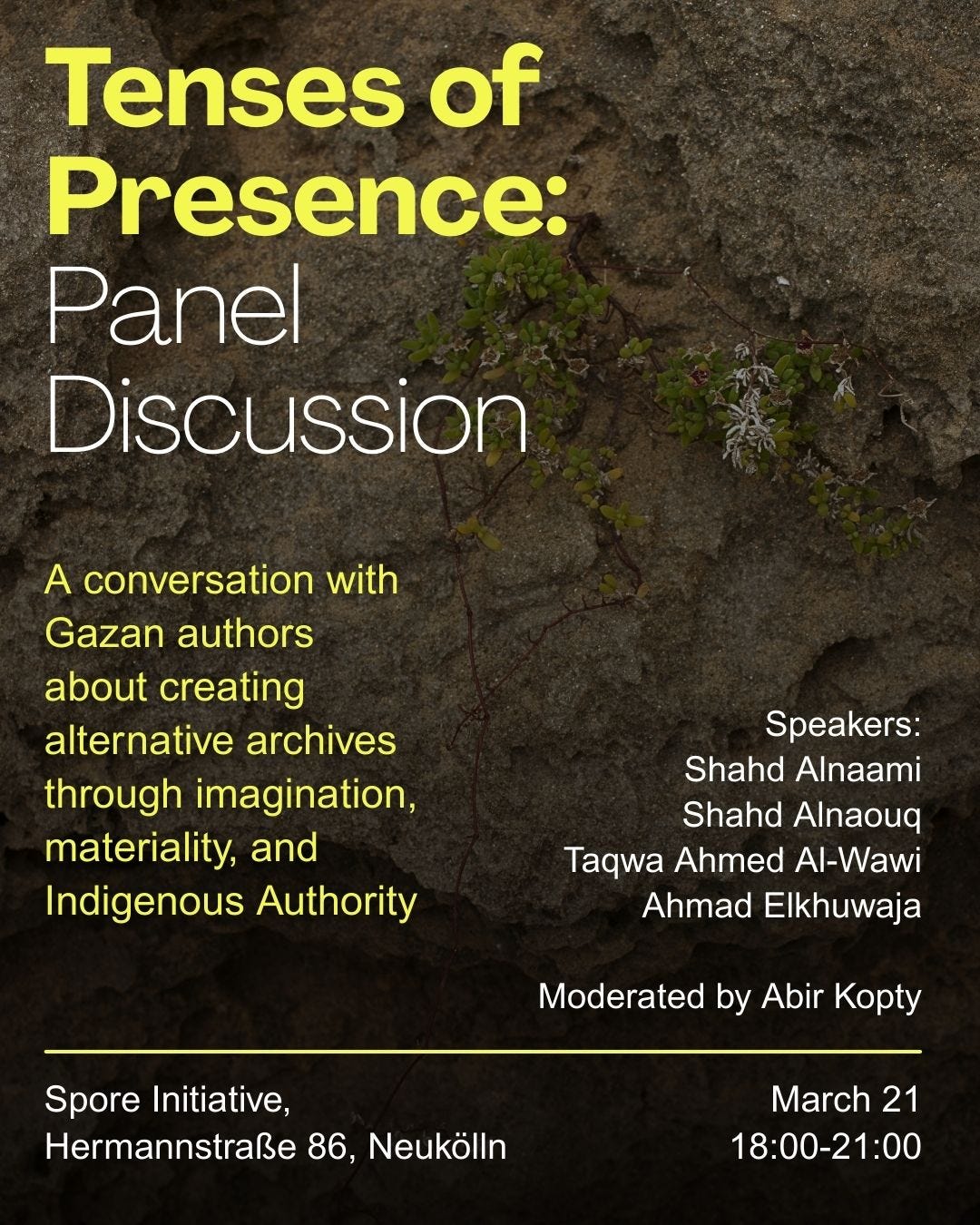 This panel brings together the Gazan authors behind Indicia's special three-story zine issue to discuss their experimental approaches to documenting, imagining, and witnessing Gaza. Across three distinct, yet connected stories, the authors explore an alternative timeline where collective land systems continued uninterrupted, the material truth and deception of concrete infrastructure, and the perspectives of non-human others who live alongside us in silence.